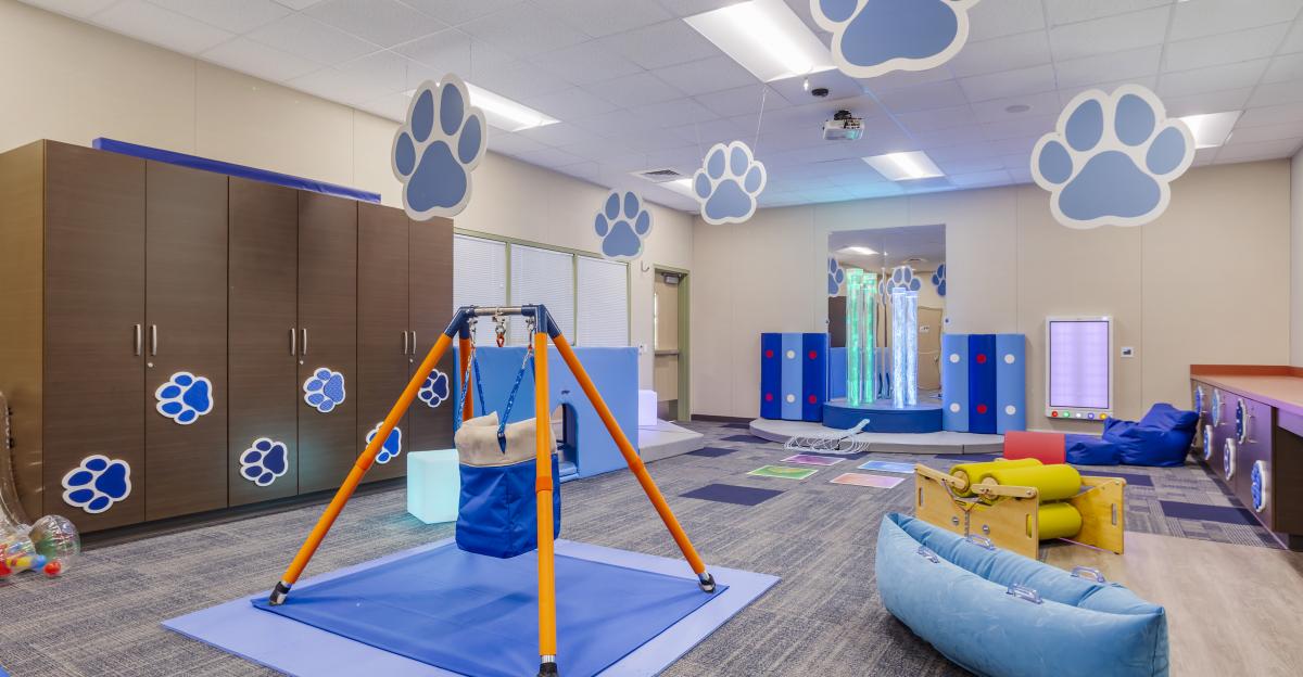 One of the key design challenges the School Specialty team faced was the presence of built-in cabinets within the room that couldn’t be moved. However, the design team turned this obstacle into an advantage by using the cabinets to create a ‘lending library’ of sensory materials that teachers could borrow for use in their classrooms. The cabinets also doubled as a tactile wall, with each paw print custom-made to feature different textures—providing students with another meaningful sensory experience.